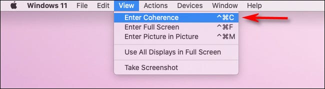 要切换到可以并排使用 Windows 和 Mac 应用程序的无缝模式,请关注“Windows 11”窗口并在菜单栏中选择“查看”>“进入一致性”。或者,您可以按键盘上的 Ctrl+Command+C。