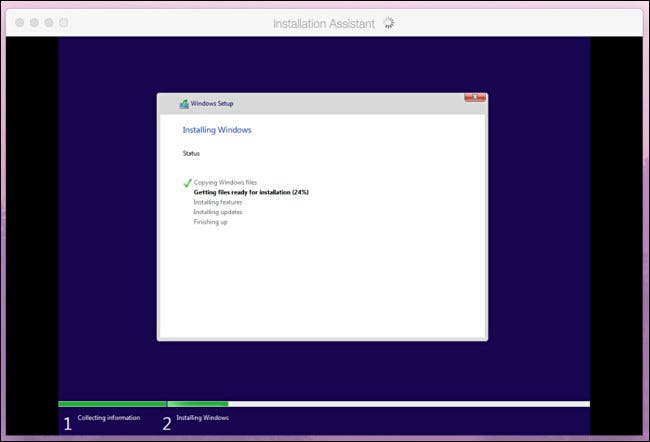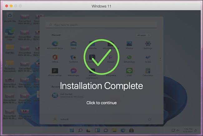 Windows 11 安装将开始。Parallels 会自动处理它,您将在 Mac 上的一个小型虚拟机窗口中看到进度。