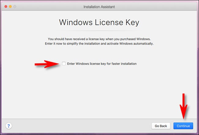 接下来,Parallels 会要求您提供 Windows 许可证密钥。如果你有一个,你现在可以输入它。如果没有,请取消选中“输入 Windows 许可证密钥以加快安装速度”框,然后单击“继续”。