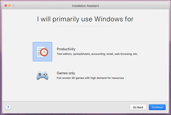 接下来,Parallels 会询问您是否主要将 Windows 用于生产力或游戏。选择符合您需求的一项,然后单击“继续”。
