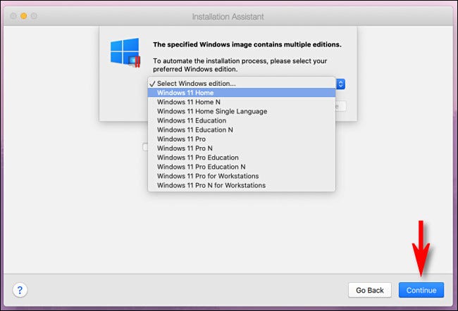 标准的 Windows 11 ISO 包含许多不同版本的 Windows 11 的安装信息。从下拉菜单中选择要安装的一个(例如“Windows 11 Home”或“Windows 11 Pro”),然后单击“继续”。请记住,每个版本都有自己的价格点,当您稍后购买 Windows 11 许可证时,该价格点将发挥作用。