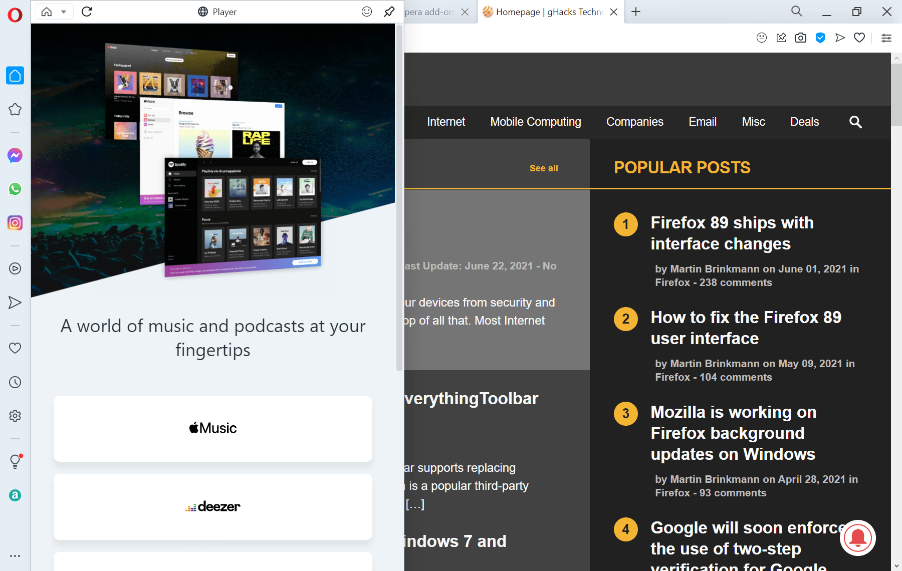 Opera G5 的第三个也是最后一个改进为侧边栏音乐播放器增加了对更多音乐服务的支持。除了支持 Apple Music、Spotify 和 YouTube Music,Opera 现在还支持 Deezer、Tidal、SoundCloud 和 Gaana。