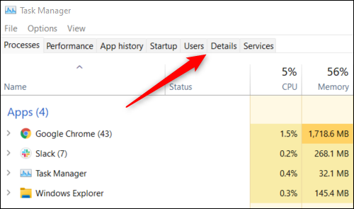 单击后,将显示有关当前正在运行的进程的许多不同信息以及标题菜单。在此标题菜单中,单击“详细信息”选项卡。