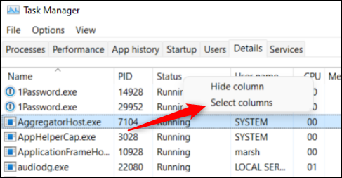 在详细信息屏幕上,您将看到多个列显示有关每个进程的各种信息。右键单击任何列标题,例如“名称”、“PID”、“状态”等。现在在出现的上下文菜单中单击“选择列”。