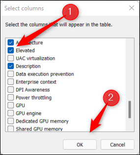 将出现“选择列”窗口。您可以在此处选择要在“任务管理器”的“详细信息”选项卡中显示的不同列类型。向下滚动直到找到“Elevated”,选中它旁边的框,然后单击“OK”。