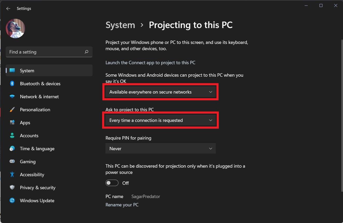首先,您需要在选项“某些 Windows 和 Android 设备可以投影到此 PC 时”下拉菜单中选择“在安全网络上随处可用”。