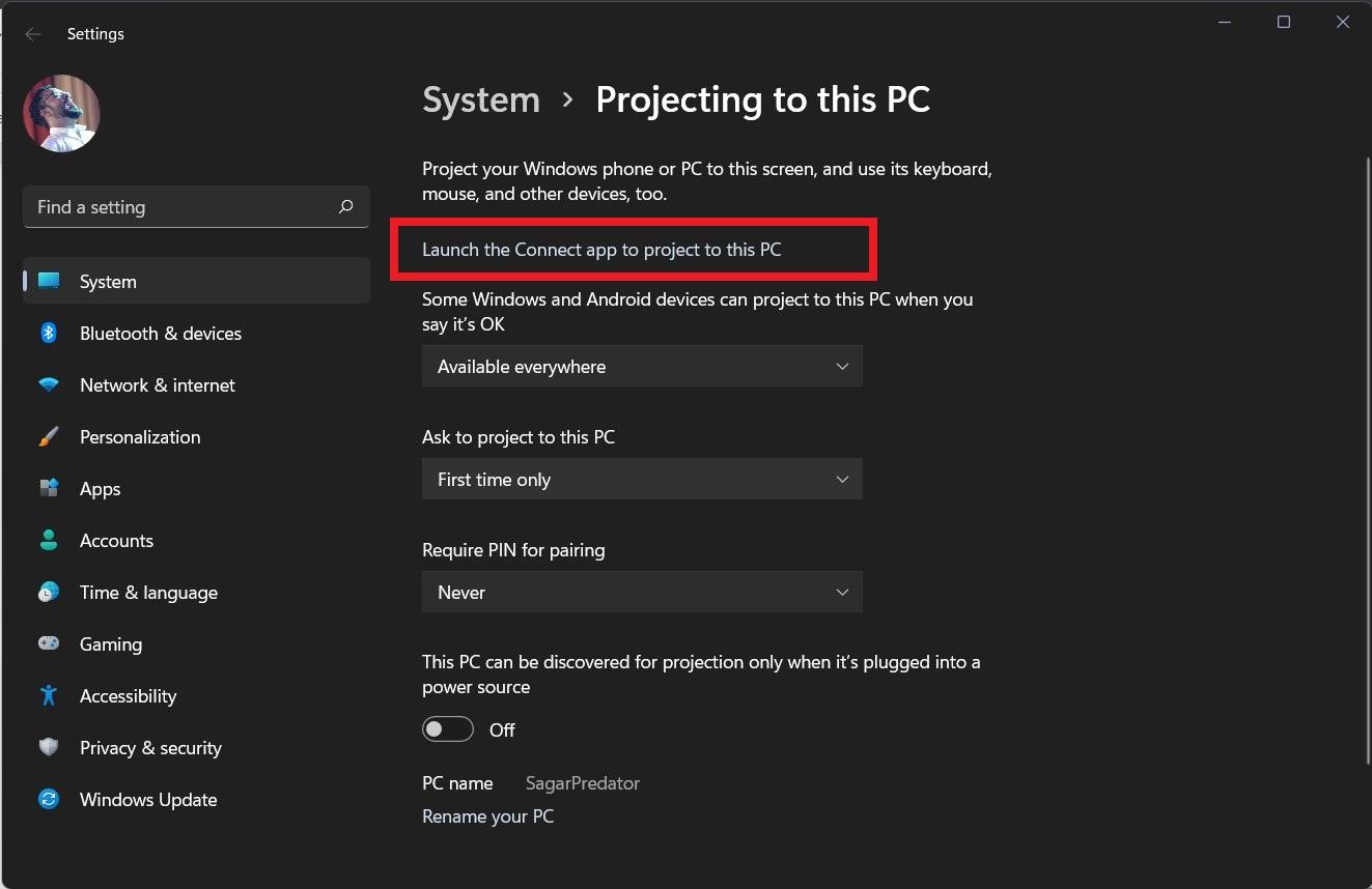 - 选择所有内容后,单击Launch the Connect 应用程序以将此 PC链接按钮投影到顶部。