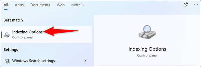 要指定要隐藏的文件类型,请打开 PC 上的“开始”菜单并搜索“索引选项”。然后在搜索结果中单击该选项。