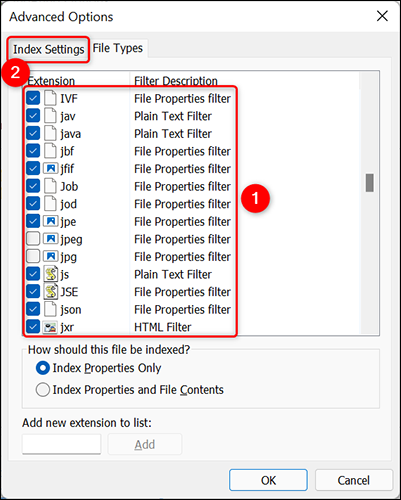 在“文件类型”选项卡中,您可以看到 Windows 当前在其搜索结果中显示的所有文件格式。要从索引中排除文件类型,请在列表中取消选择该类型。
