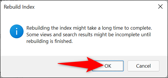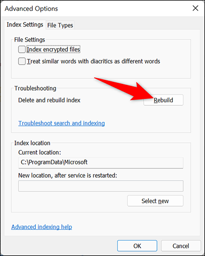 在“索引设置”选项卡上,在“删除和重建索引”旁边,单击“重建”。这将创建一个新的搜索索引,完成后将删除您选择的文件类型。