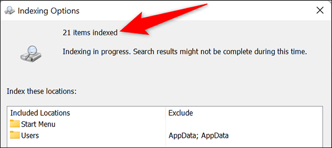 您现在位于“索引选项”窗口。在这里,在顶部,您将看到索引构建的当前状态。重建索引所需的时间取决于您的 PC 上有多少文件。如果您有很多文件,该过程可能需要几分钟时间。