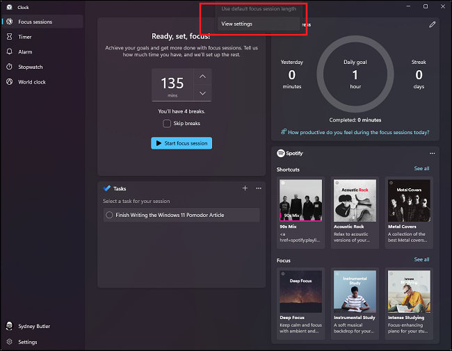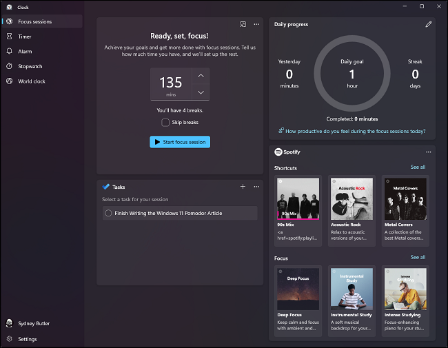 打开时钟应用程序后,在左侧边栏中选择 Focus Session。您将看到四个小节: