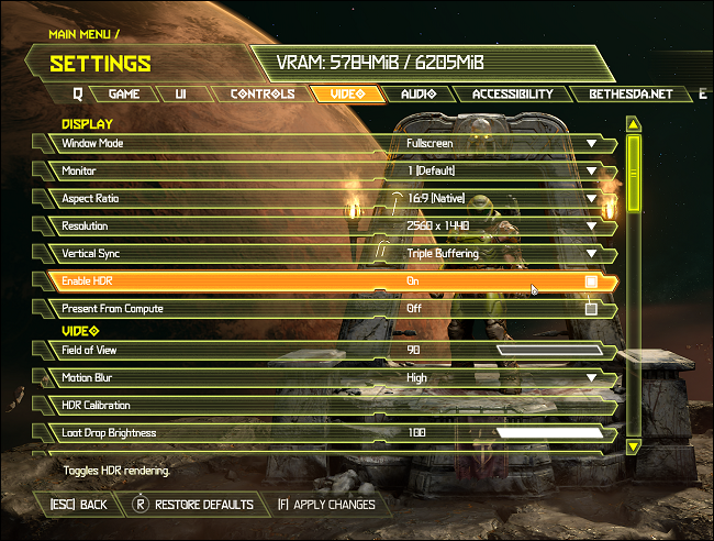 一些支持 HDR 的视频游戏也可以使用菜单项来打开和关闭该功能。例如,来自Doom Eternal 的这个屏幕截图显示了一个菜单条目,您可以在其中启用或禁用 HDR。