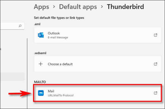 在电子邮件应用程序的“默认应用程序”设置页面上,单击“邮件”下方的按钮。这将配置 Windows 将如何打开网页中常见的“mailto:”链接。
