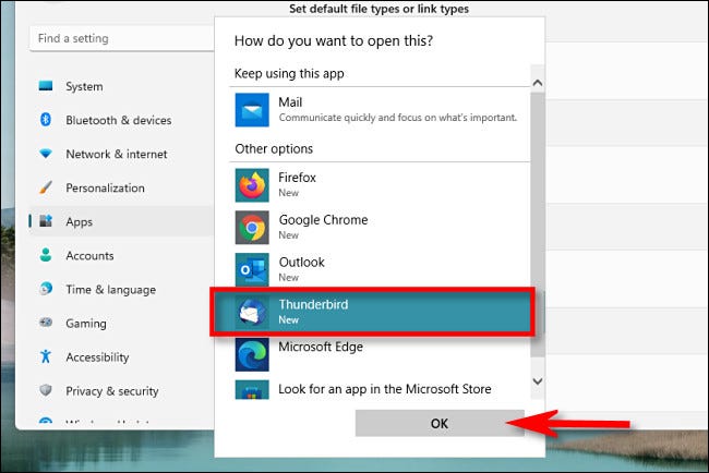 在弹出的“你想如何打开这个”窗口中,选择你想作为“mailto:”链接默认使用的电子邮件应用程序,然后单击“确定”。
