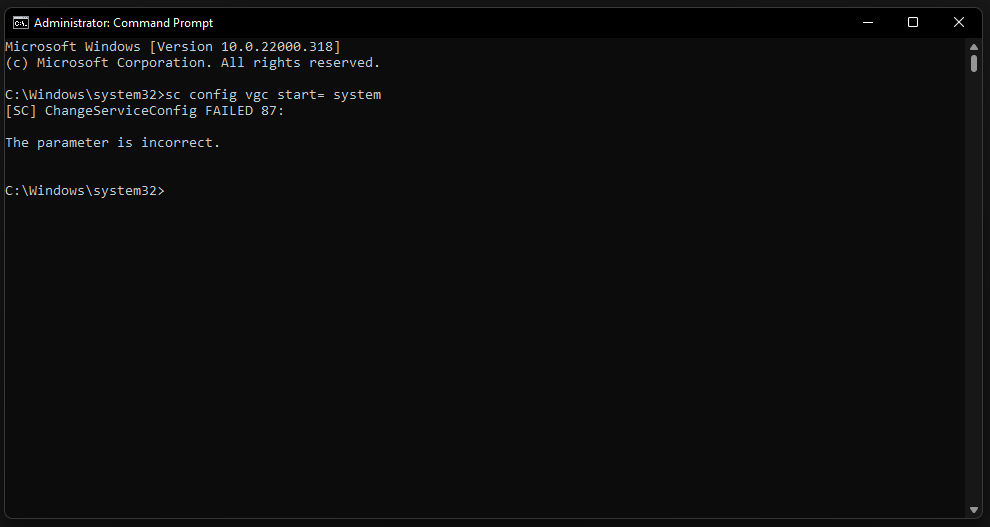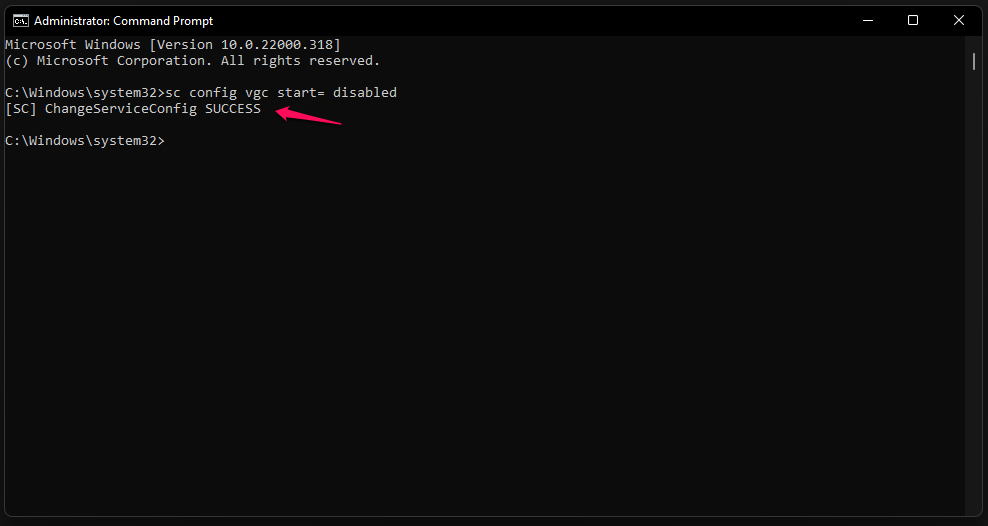 - “ [SC] ChangeServiceConfig SUCCESS ”消息显示在屏幕上。