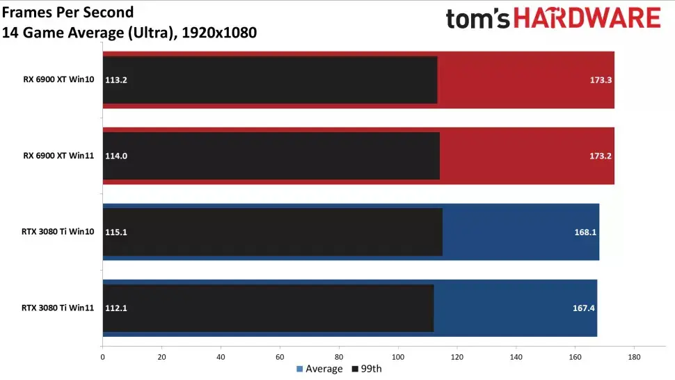 具体来说,Radeon RX 6900 XT 和 GeForce RTX 3080 Ti,AMD 的旗舰和 Nvidia 在性能方面的可比 GPU。测试发现,Radeon 在 Windows 10 和 Windows 11 的性能上并没有太大的差异。