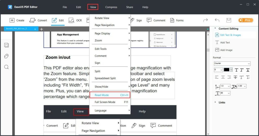我们名单上的姓氏是 EaseUS PDF Editor。该应用程序具有非常简单的用户界面,即使是新手也能轻松习惯 PDF 文件。EaseUS PDF Editor 允许您以不同模式阅读 PDF 文件,包括旋转、缩放等。
