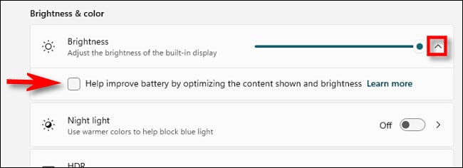 在 Windows 11 中,单击“亮度”滑块旁边的小箭头以展开一个小菜单,然后取消选中“通过优化显示的内容和亮度来帮助提高电池电量”。