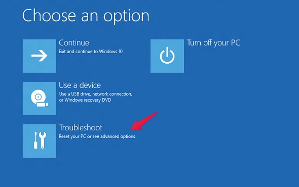 - 在Windows 恢复屏幕中,单击疑难解答。